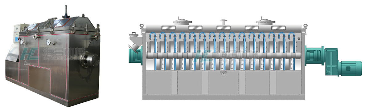 該設(shè)備采用全新的結(jié)構(gòu)和工作原理,它們的主要結(jié)構(gòu)如下圖所示。在一個(gè)臥式長(zhǎng)槽形容器內(nèi)組合排列了很多空心冷卻板片,中心攪拌軸從所有的冷卻板片內(nèi)穿越通過,在每?jī)蓚€(gè)空心冷卻板片之間安裝有阻流式分隔圓盤和很多旋輪推進(jìn)刮壁式攪拌裝置,刮壁攪拌使所有的冷卻表面都起到清壁作用,使傳熱和冷卻效率大大提高。