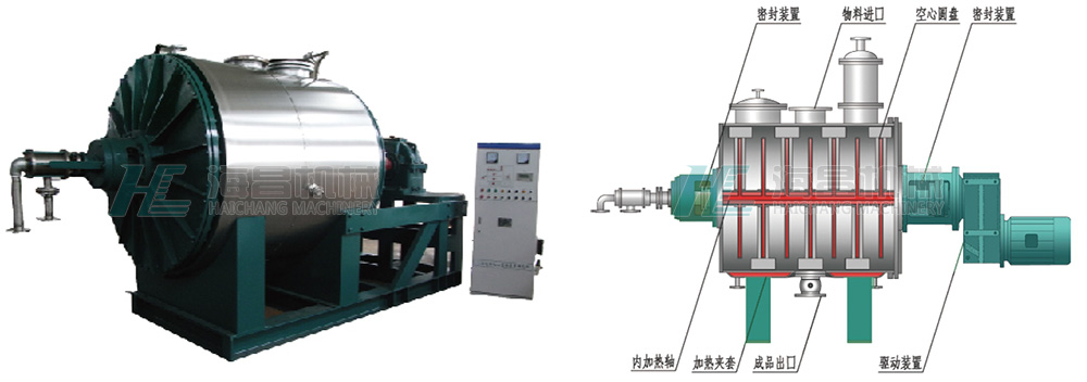 2、除簡體夾套加熱以外,圓盤(或螺帶)也對物料進(jìn)行加熱,加熱面積是同樣容積的雙錐回轉(zhuǎn)真空干燥機(jī)及把式真空干燥機(jī)的3~5倍。
